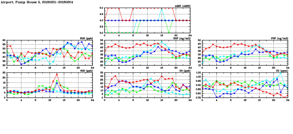 | Air Quality Data Time Series in Airport, Pump House 5 (2018/02/04) | ( Line colors: Day -3 Day -2 Day -1 Current day ) | 2D Map Current AQHI |