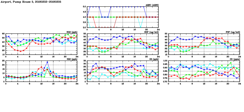 | Air Quality Data Time Series in Airport, Pump House 5 (2018/02/05) | ( Line colors: Day -3 Day -2 Day -1 Current day ) | 2D Map Current AQHI |
