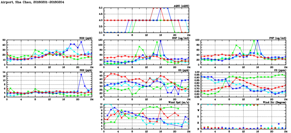 | Air Quality Data Time Series in Airport, Sha Chau (2018/02/04) | ( Line colors: Day -3 Day -2 Day -1 Current day ) | 2D Map Current AQHI |