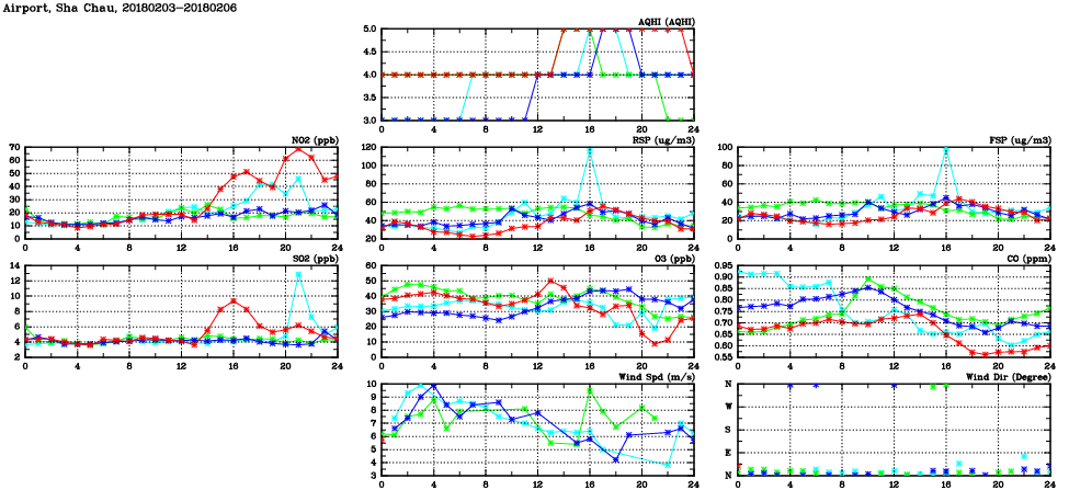 | Air Quality Data Time Series in Airport, Sha Chau (2018/02/06) | ( Line colors: Day -3 Day -2 Day -1 Current day ) | 2D Map Current AQHI |