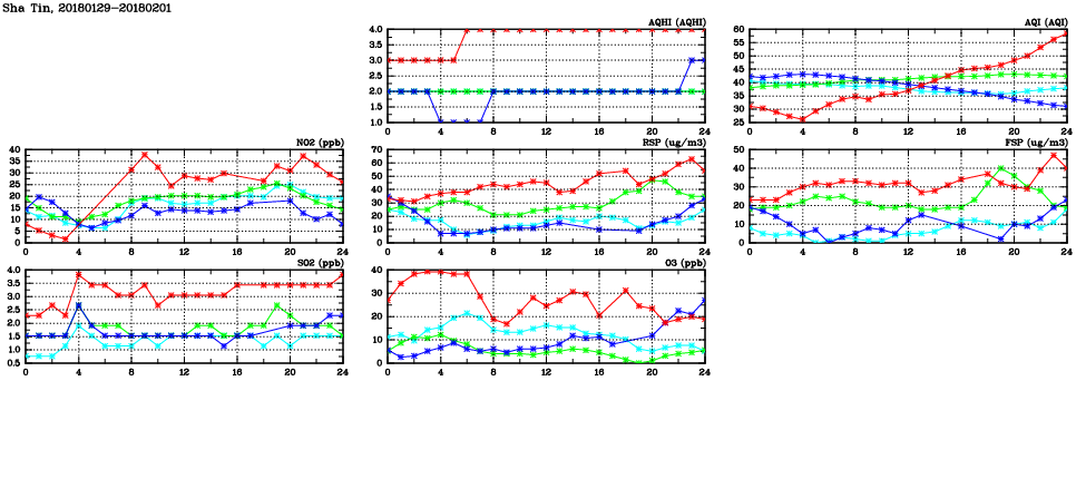 | Air Quality Data Time Series in Sha Tin (2018/02/01) | ( Line colors: Day -3 Day -2 Day -1 Current day ) | 2D Map Current AQHI |