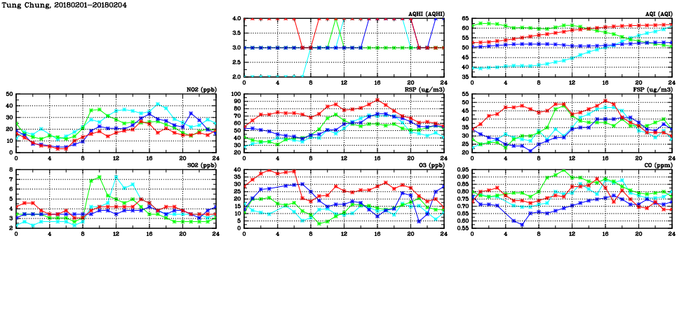 | Air Quality Data Time Series in Tung Chung (2018/02/04) | ( Line colors: Day -3 Day -2 Day -1 Current day ) | 2D Map Current AQHI |