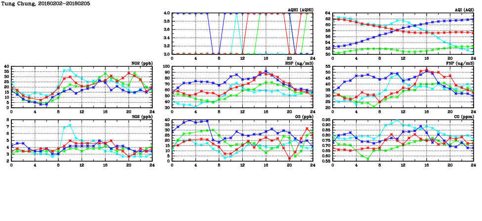 | Air Quality Data Time Series in Tung Chung (2018/02/05) | ( Line colors: Day -3 Day -2 Day -1 Current day ) | 2D Map Current AQHI |