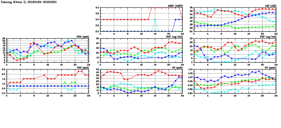 | Air Quality Data Time Series in Tseung Kwan O (2018/02/01) | ( Line colors: Day -3 Day -2 Day -1 Current day ) | 2D Map Current AQHI |