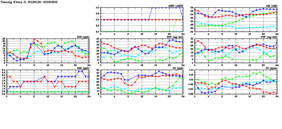 | Air Quality Data Time Series in Tseung Kwan O (2018/02/02) | ( Line colors: Day -3 Day -2 Day -1 Current day ) | 2D Map Current AQHI |