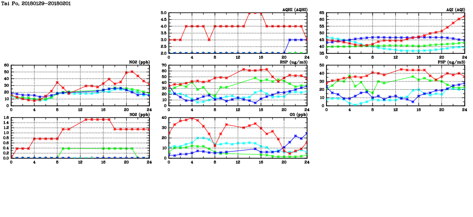 | Air Quality Data Time Series in Tai Po (2018/02/01) | ( Line colors: Day -3 Day -2 Day -1 Current day ) | 2D Map Current AQHI |