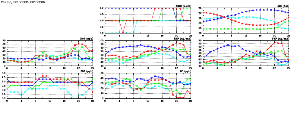 | Air Quality Data Time Series in Tai Po (2018/02/05) | ( Line colors: Day -3 Day -2 Day -1 Current day ) | 2D Map Current AQHI |