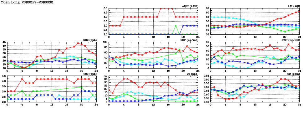 | Air Quality Data Time Series in Yuen Long (2018/02/01) | ( Line colors: Day -3 Day -2 Day -1 Current day ) | 2D Map Current AQHI |