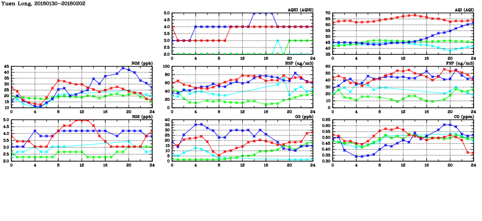 | Air Quality Data Time Series in Yuen Long (2018/02/02) | ( Line colors: Day -3 Day -2 Day -1 Current day ) | 2D Map Current AQHI |