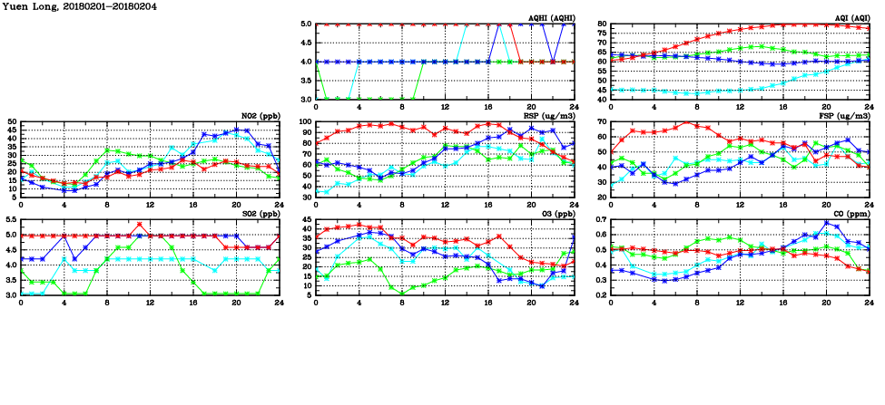 | Air Quality Data Time Series in Yuen Long (2018/02/04) | ( Line colors: Day -3 Day -2 Day -1 Current day ) | 2D Map Current AQHI |