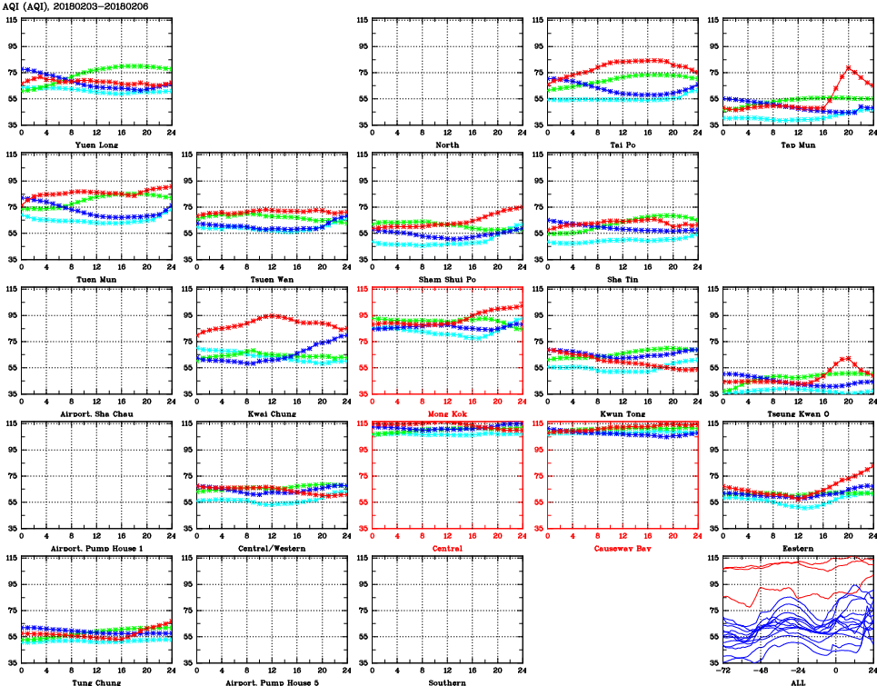 | Air Quality Data Time Series for AQI (2018/02/06) | ( Line colors: Day -3 Day -2 Day -1 Current day ) | 2D Map Current AQHI |