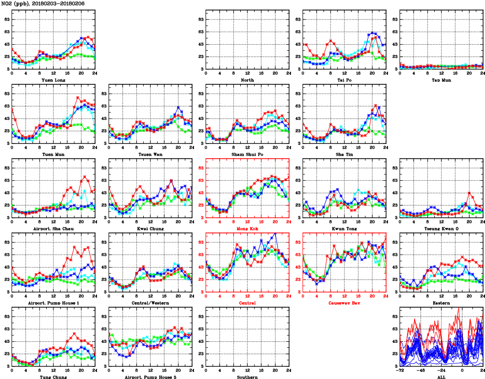 | Air Quality Data Time Series for NO2 (2018/02/06) | ( Line colors: Day -3 Day -2 Day -1 Current day ) | 2D Map Current AQHI |
