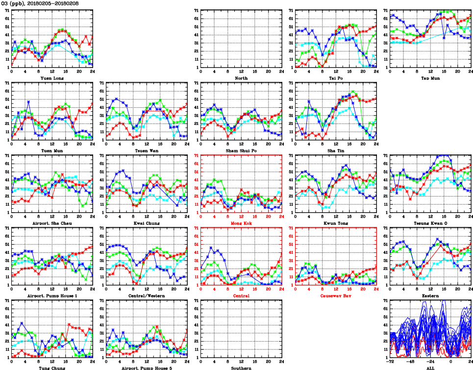 | Air Quality Data Time Series for O3 (2018/02/08) | ( Line colors: Day -3 Day -2 Day -1 Current day ) | 2D Map Current AQHI |