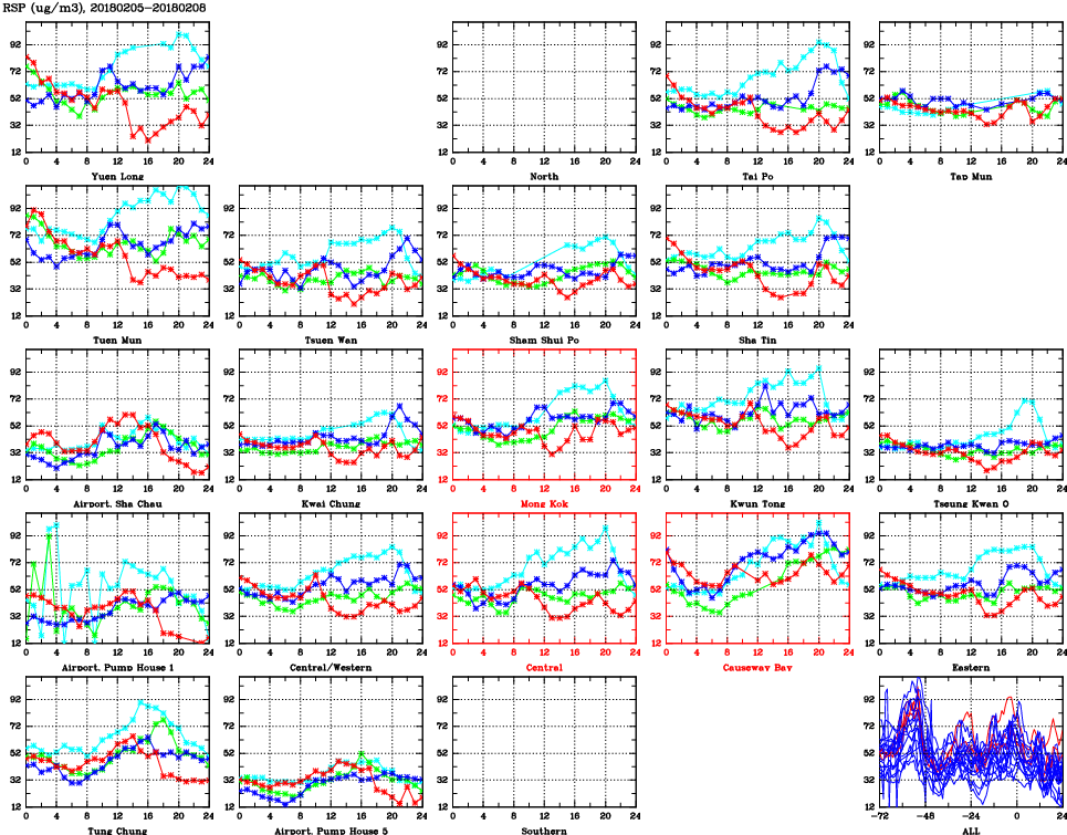 | Air Quality Data Time Series for RSP (2018/02/08) | ( Line colors: Day -3 Day -2 Day -1 Current day ) | 2D Map Current AQHI |