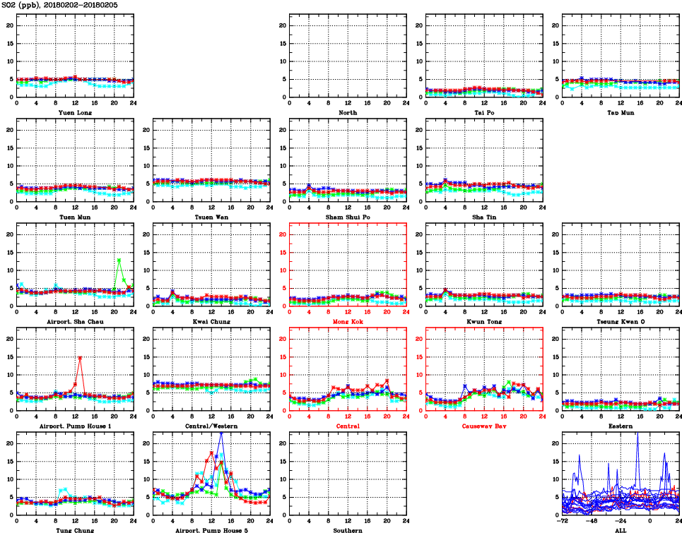 | Air Quality Data Time Series for SO2 (2018/02/05) | ( Line colors: Day -3 Day -2 Day -1 Current day ) | 2D Map Current AQHI |