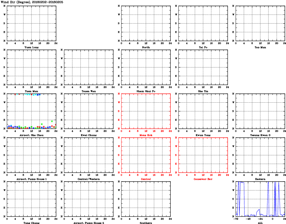 | Air Quality Data Time Series for WD (2018/02/05) | ( Line colors: Day -3 Day -2 Day -1 Current day ) | 2D Map Current AQHI |