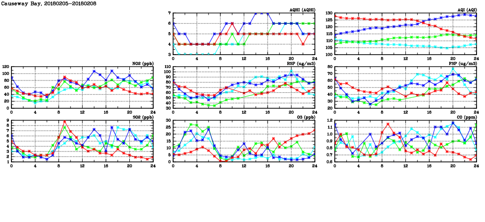 | Air Quality Data Time Series in Causeway Bay (2018/02/08) | ( Line colors: Day -3 Day -2 Day -1 Current day ) | 2D Map Current AQHI |