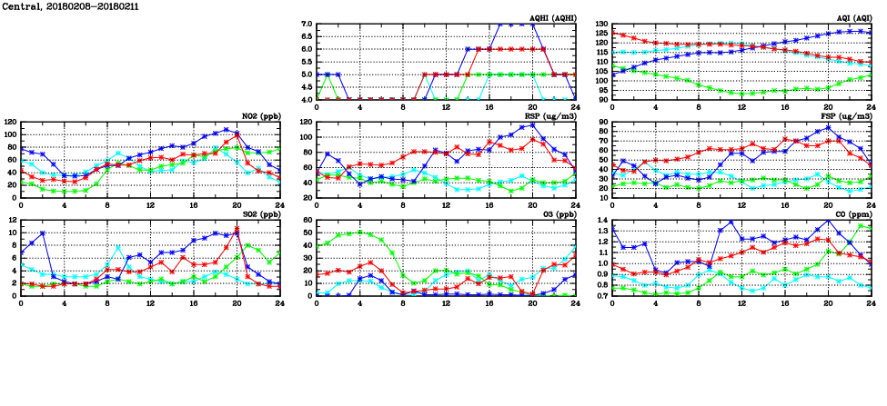 | Air Quality Data Time Series in Central (2018/02/11) | ( Line colors: Day -3 Day -2 Day -1 Current day ) | 2D Map Current AQHI |