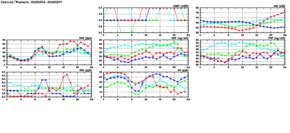 | Air Quality Data Time Series in Central/Western (2018/02/07) | ( Line colors: Day -3 Day -2 Day -1 Current day ) | 2D Map Current AQHI |