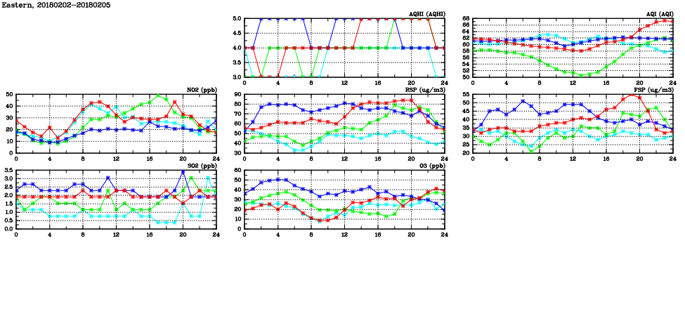 | Air Quality Data Time Series in Eastern (2018/02/05) | ( Line colors: Day -3 Day -2 Day -1 Current day ) | 2D Map Current AQHI |