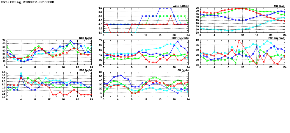 | Air Quality Data Time Series in Kwai Chung (2018/02/08) | ( Line colors: Day -3 Day -2 Day -1 Current day ) | 2D Map Current AQHI |