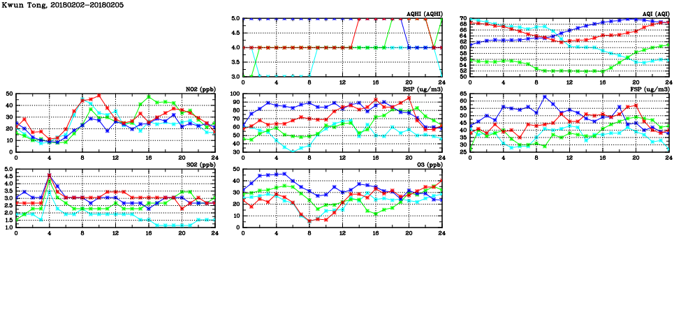 | Air Quality Data Time Series in Kwun Tong (2018/02/05) | ( Line colors: Day -3 Day -2 Day -1 Current day ) | 2D Map Current AQHI |
