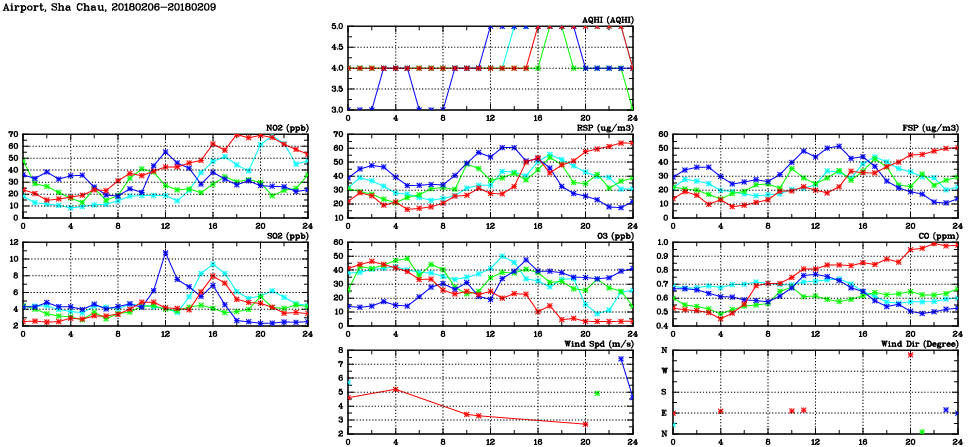 | Air Quality Data Time Series in Airport, Sha Chau (2018/02/09) | ( Line colors: Day -3 Day -2 Day -1 Current day ) | 2D Map Current AQHI |
