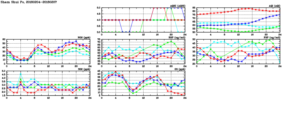| Air Quality Data Time Series in Sham Shui Po (2018/02/07) | ( Line colors: Day -3 Day -2 Day -1 Current day ) | 2D Map Current AQHI |