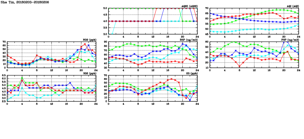| Air Quality Data Time Series in Sha Tin (2018/02/06) | ( Line colors: Day -3 Day -2 Day -1 Current day ) | 2D Map Current AQHI |