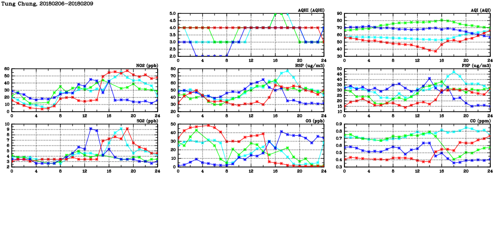 | Air Quality Data Time Series in Tung Chung (2018/02/09) | ( Line colors: Day -3 Day -2 Day -1 Current day ) | 2D Map Current AQHI |