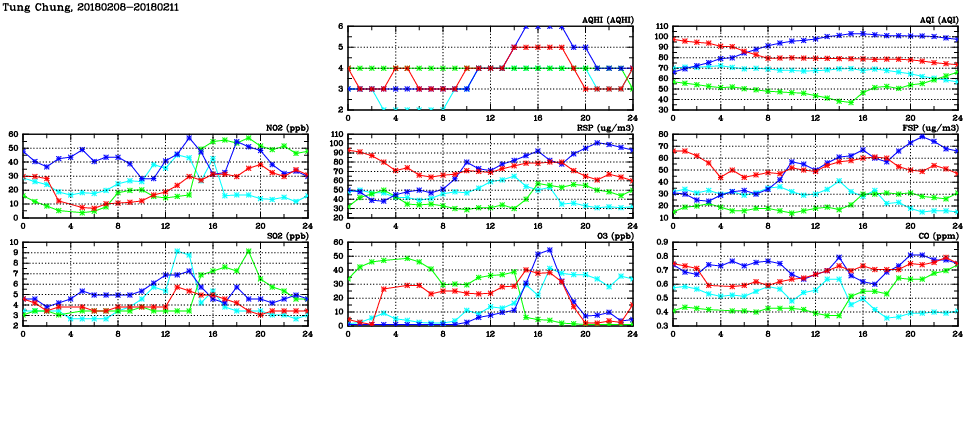 | Air Quality Data Time Series in Tung Chung (2018/02/11) | ( Line colors: Day -3 Day -2 Day -1 Current day ) | 2D Map Current AQHI |