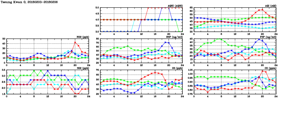 | Air Quality Data Time Series in Tseung Kwan O (2018/02/06) | ( Line colors: Day -3 Day -2 Day -1 Current day ) | 2D Map Current AQHI |