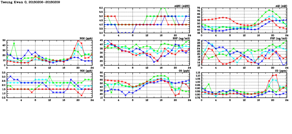 | Air Quality Data Time Series in Tseung Kwan O (2018/02/09) | ( Line colors: Day -3 Day -2 Day -1 Current day ) | 2D Map Current AQHI |