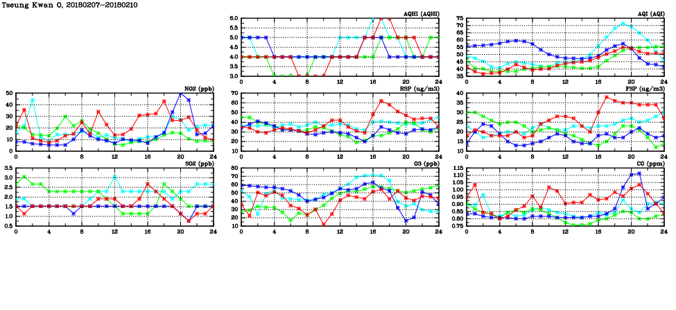 | Air Quality Data Time Series in Tseung Kwan O (2018/02/10) | ( Line colors: Day -3 Day -2 Day -1 Current day ) | 2D Map Current AQHI |