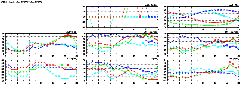 | Air Quality Data Time Series in Tuen Mun (2018/02/05) | ( Line colors: Day -3 Day -2 Day -1 Current day ) | 2D Map Current AQHI |