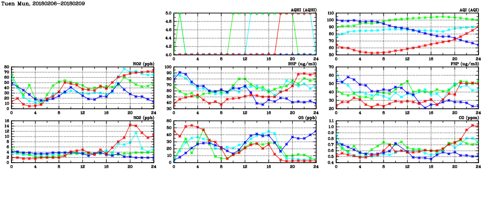 | Air Quality Data Time Series in Tuen Mun (2018/02/09) | ( Line colors: Day -3 Day -2 Day -1 Current day ) | 2D Map Current AQHI |