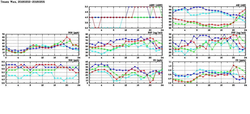 | Air Quality Data Time Series in Tsuen Wan (2018/02/05) | ( Line colors: Day -3 Day -2 Day -1 Current day ) | 2D Map Current AQHI |