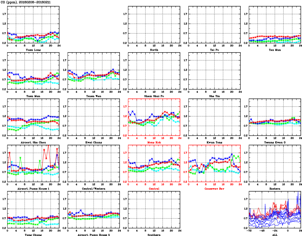 | Air Quality Data Time Series for CO (2018/02/11) | ( Line colors: Day -3 Day -2 Day -1 Current day ) | 2D Map Current AQHI |