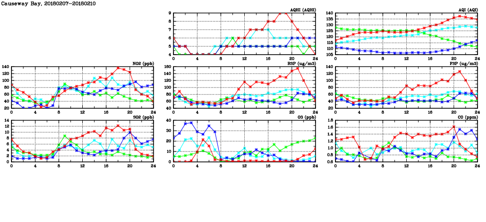 | Air Quality Data Time Series in Causeway Bay (2018/02/10) | ( Line colors: Day -3 Day -2 Day -1 Current day ) | 2D Map Current AQHI |