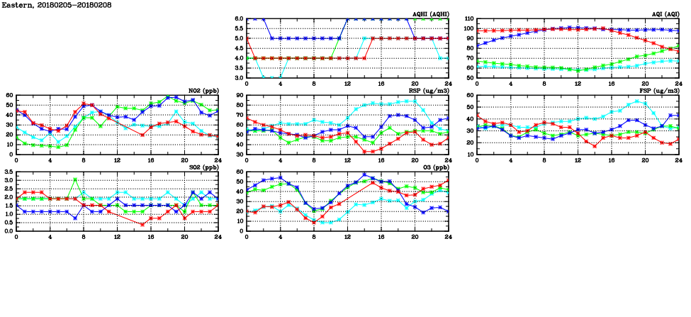 | Air Quality Data Time Series in Eastern (2018/02/08) | ( Line colors: Day -3 Day -2 Day -1 Current day ) | 2D Map Current AQHI |