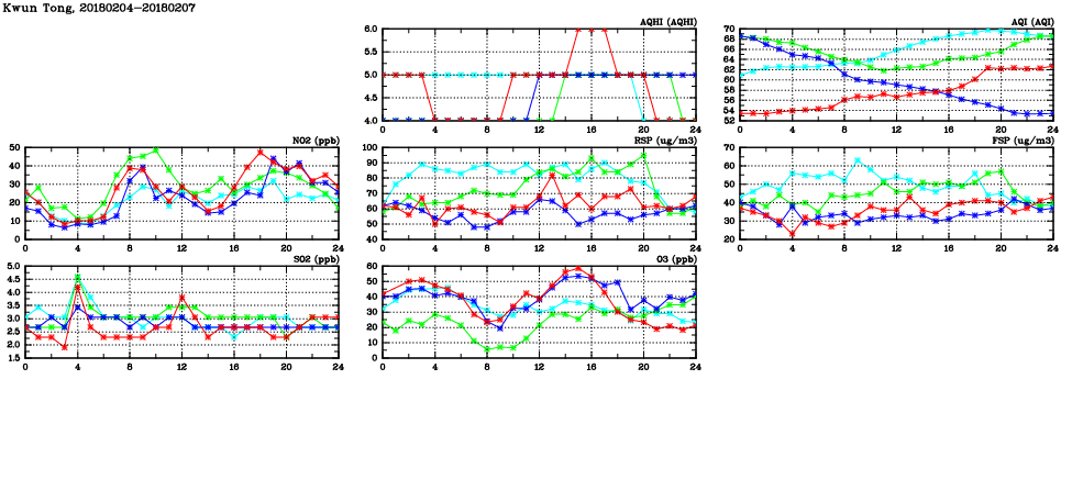 | Air Quality Data Time Series in Kwun Tong (2018/02/07) | ( Line colors: Day -3 Day -2 Day -1 Current day ) | 2D Map Current AQHI |