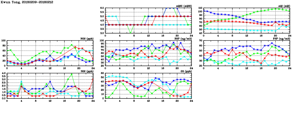 | Air Quality Data Time Series in Kwun Tong (2018/02/12) | ( Line colors: Day -3 Day -2 Day -1 Current day ) | 2D Map Current AQHI |