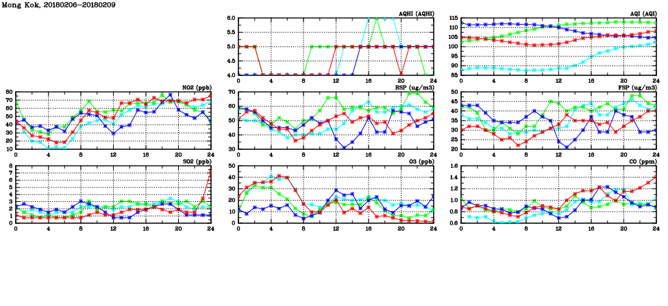 | Air Quality Data Time Series in Mong Kok (2018/02/09) | ( Line colors: Day -3 Day -2 Day -1 Current day ) | 2D Map Current AQHI |