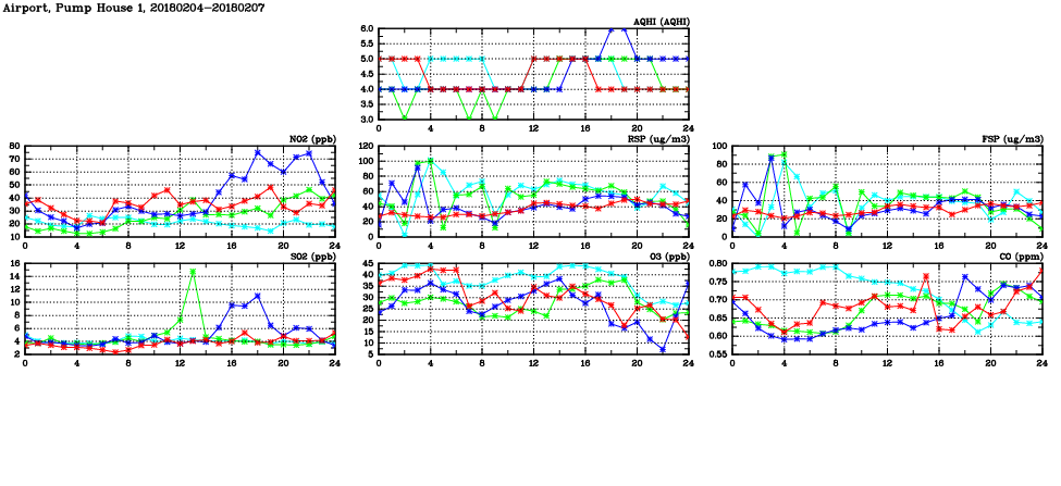 | Air Quality Data Time Series in Airport, Pump House 1 (2018/02/07) | ( Line colors: Day -3 Day -2 Day -1 Current day ) | 2D Map Current AQHI |