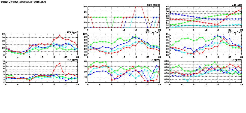 | Air Quality Data Time Series in Tung Chung (2018/02/06) | ( Line colors: Day -3 Day -2 Day -1 Current day ) | 2D Map Current AQHI |