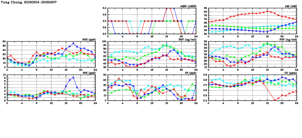 | Air Quality Data Time Series in Tung Chung (2018/02/07) | ( Line colors: Day -3 Day -2 Day -1 Current day ) | 2D Map Current AQHI |