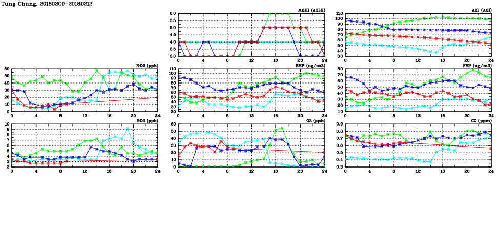 | Air Quality Data Time Series in Tung Chung (2018/02/12) | ( Line colors: Day -3 Day -2 Day -1 Current day ) | 2D Map Current AQHI |