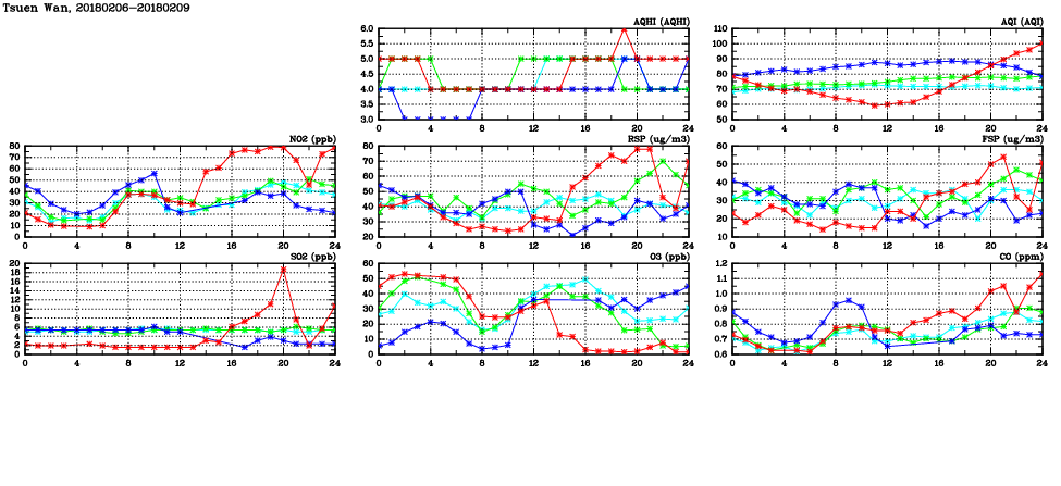 | Air Quality Data Time Series in Tsuen Wan (2018/02/09) | ( Line colors: Day -3 Day -2 Day -1 Current day ) | 2D Map Current AQHI |
