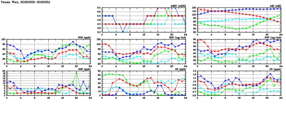 | Air Quality Data Time Series in Tsuen Wan (2018/02/11) | ( Line colors: Day -3 Day -2 Day -1 Current day ) | 2D Map Current AQHI |