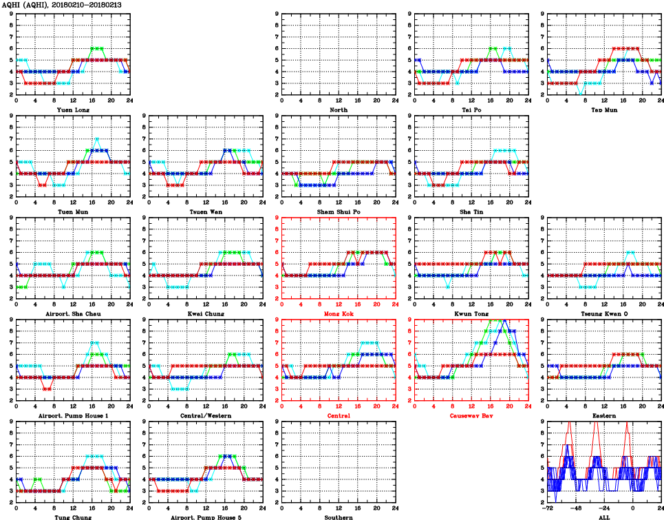 | Air Quality Data Time Series for AQHI (2018/02/13) | ( Line colors: Day -3 Day -2 Day -1 Current day ) | 2D Map Current AQHI |